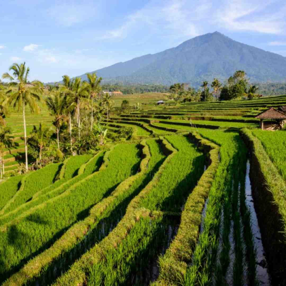 Kaki bukit indah bertingkat yang memiliki persawahan di tengah pepohonan yang rimbun, ditambah zip line dan ayunan hutan.