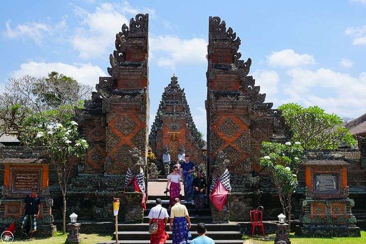 Kuil Bali yang ramai, dengan ukiran & pahatan batu, pengunjung harus mengenakan sarung untuk masuk.