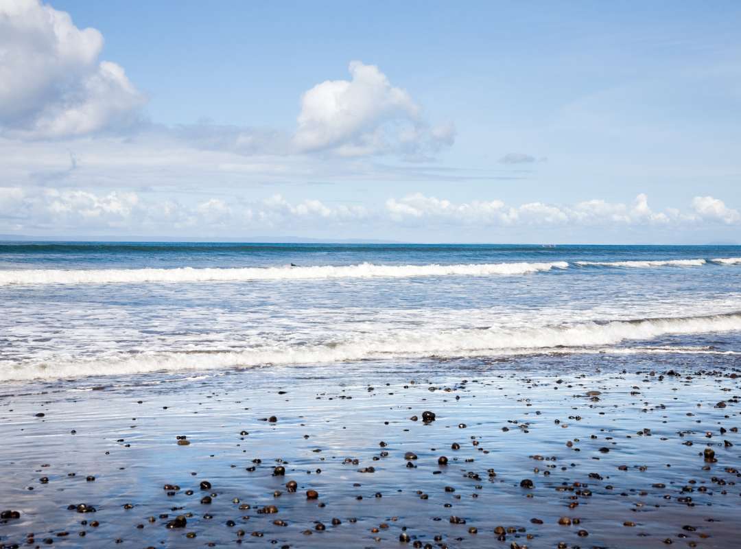 Pantai pasir hitam berbatu ini dekat dengan beberapa tempat makan simpel dan Museum Ogoh-Ogoh Soka
