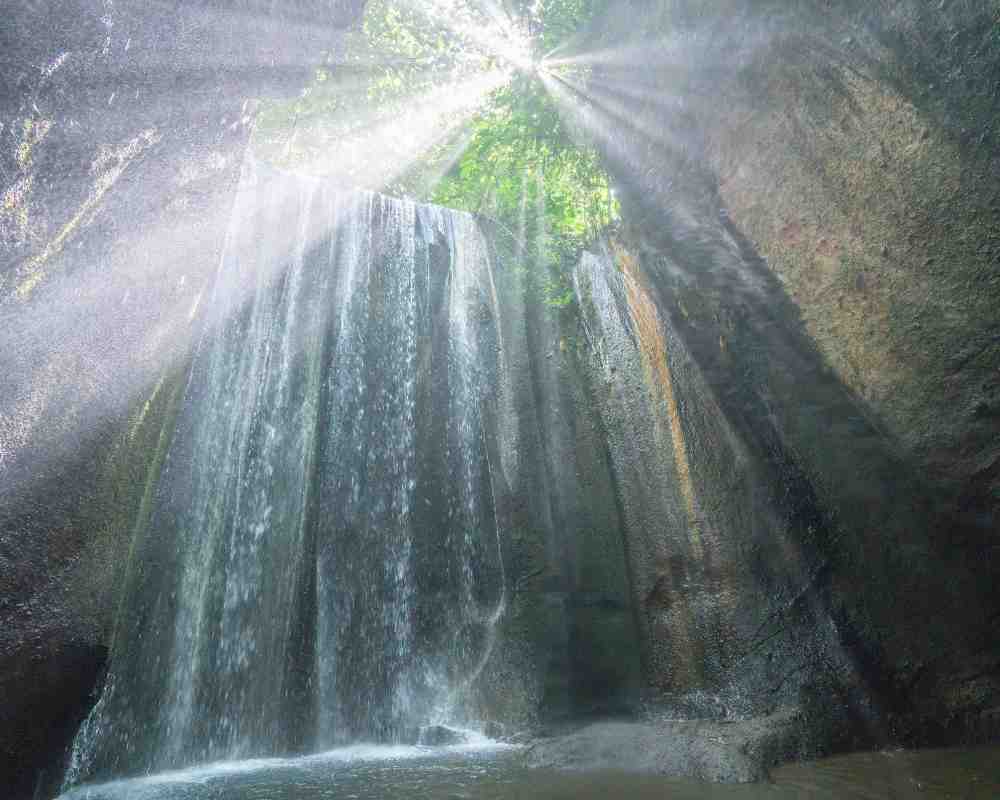 Air terjun yang mengalir melalui celah di gua, diterangi oleh matahari & dicapai melalui jalur hutan.